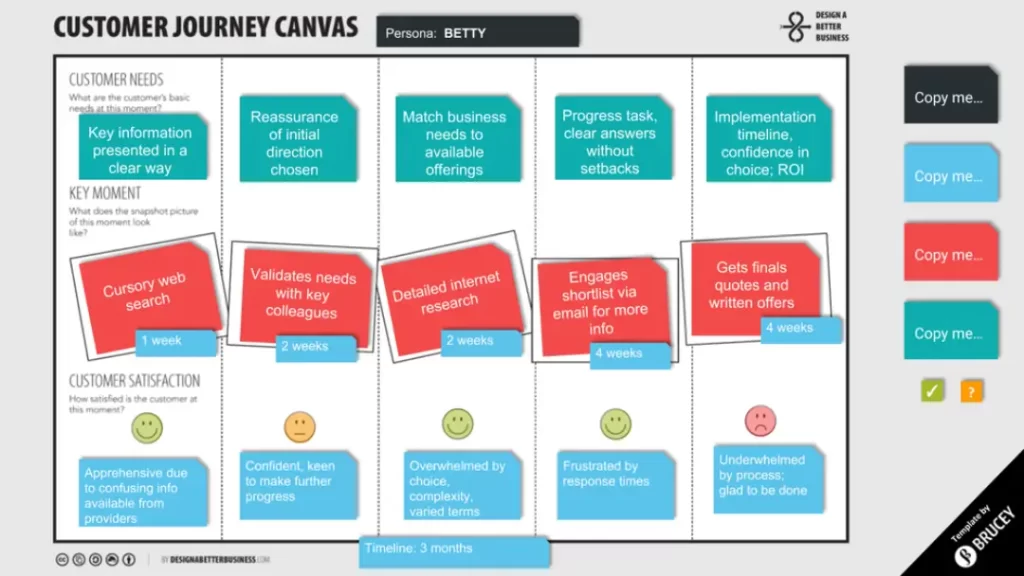 حداقل ۵ لحظه را در سفر مشتری مشخص کنید. بازه زمانی چقدر است؟ تجربه گام به گام مشتری چیست؟ چه میزان زمان در سفر طی میشود؟ پیچیدهاش نکنید: با مشتریان آزمایش کنید تا متوجه شوید چه چیزی را باید وارد بوم کنید.